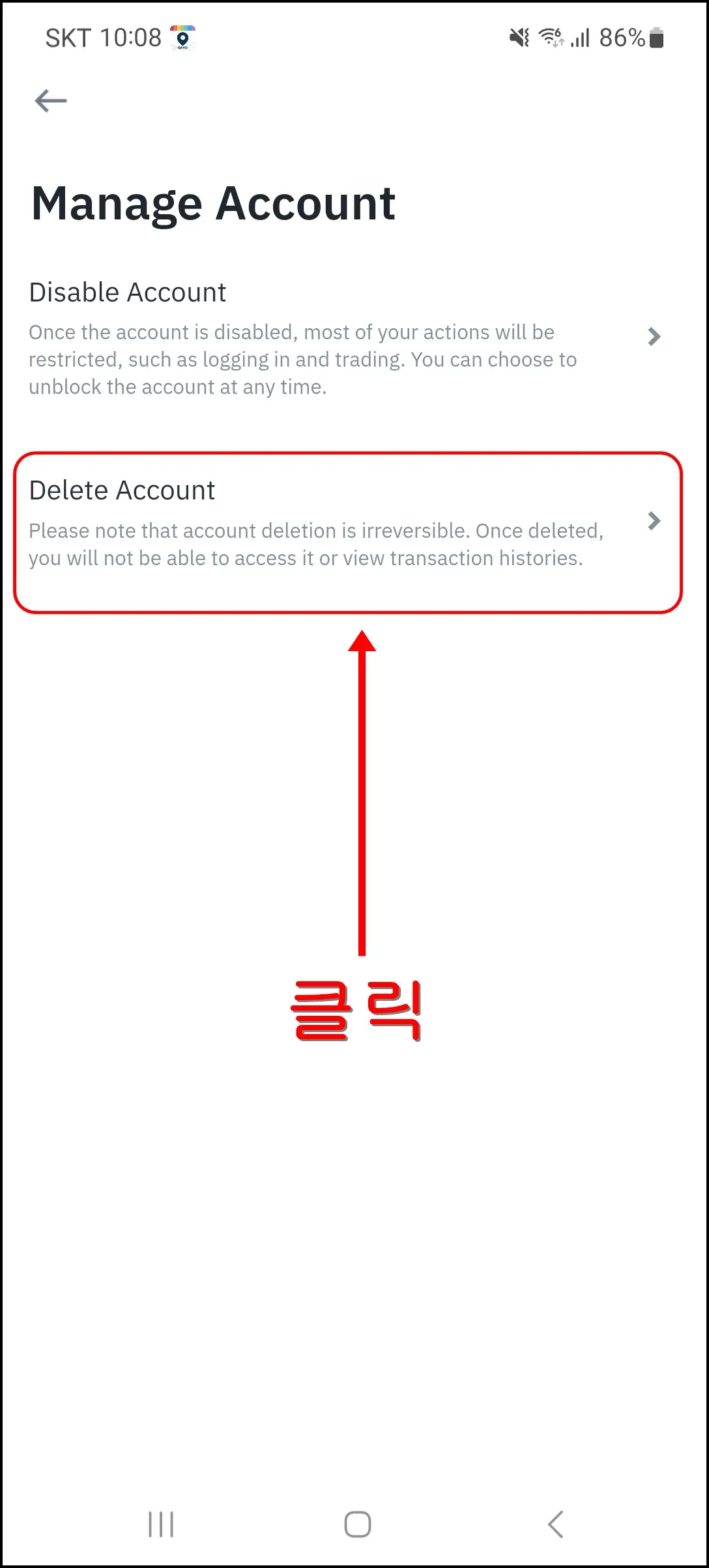 7. 위와 같이 Delete Account라는 메뉴를 보실수 있습니다. 아래 경고문장의 내용은 '계정 삭제는 되돌릴 수 없다는점에 유의하세요. 삭제되면 해당 항목에 액세스하거나 거래 내역을 볼 수 없습니다.' 라는 내용입니다. 반드시 확인해주시고 탈퇴를 진행하시면 되겠습니다.