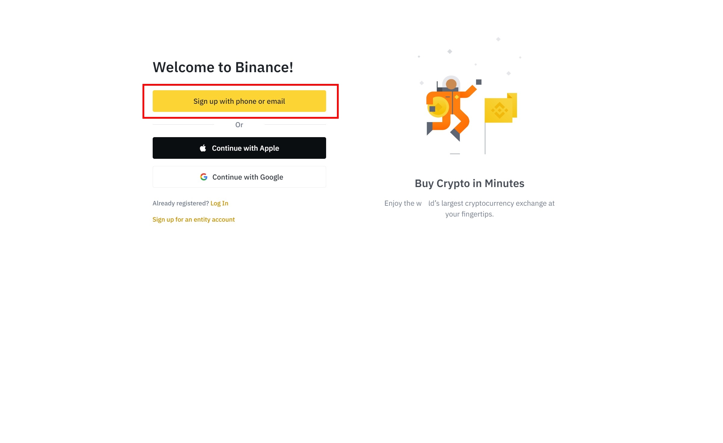 바이낸스 거래소에 계정을 만드시려면 위의 'sign up with phone or email'을 클릭하시고 진행하셔야 합니다.