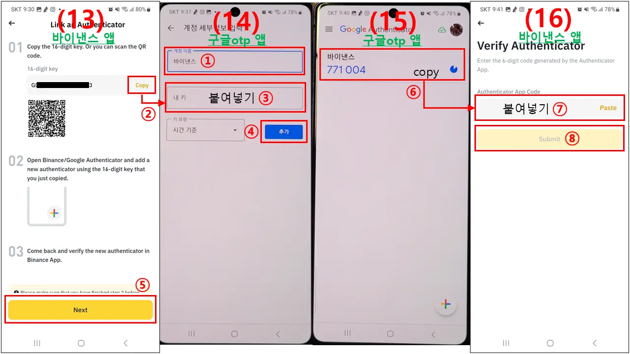 (13~16) 구글otp 에서 설정 키 입력을 클릭하셨다면 ①~⑧ 순서대로 따라하세요.