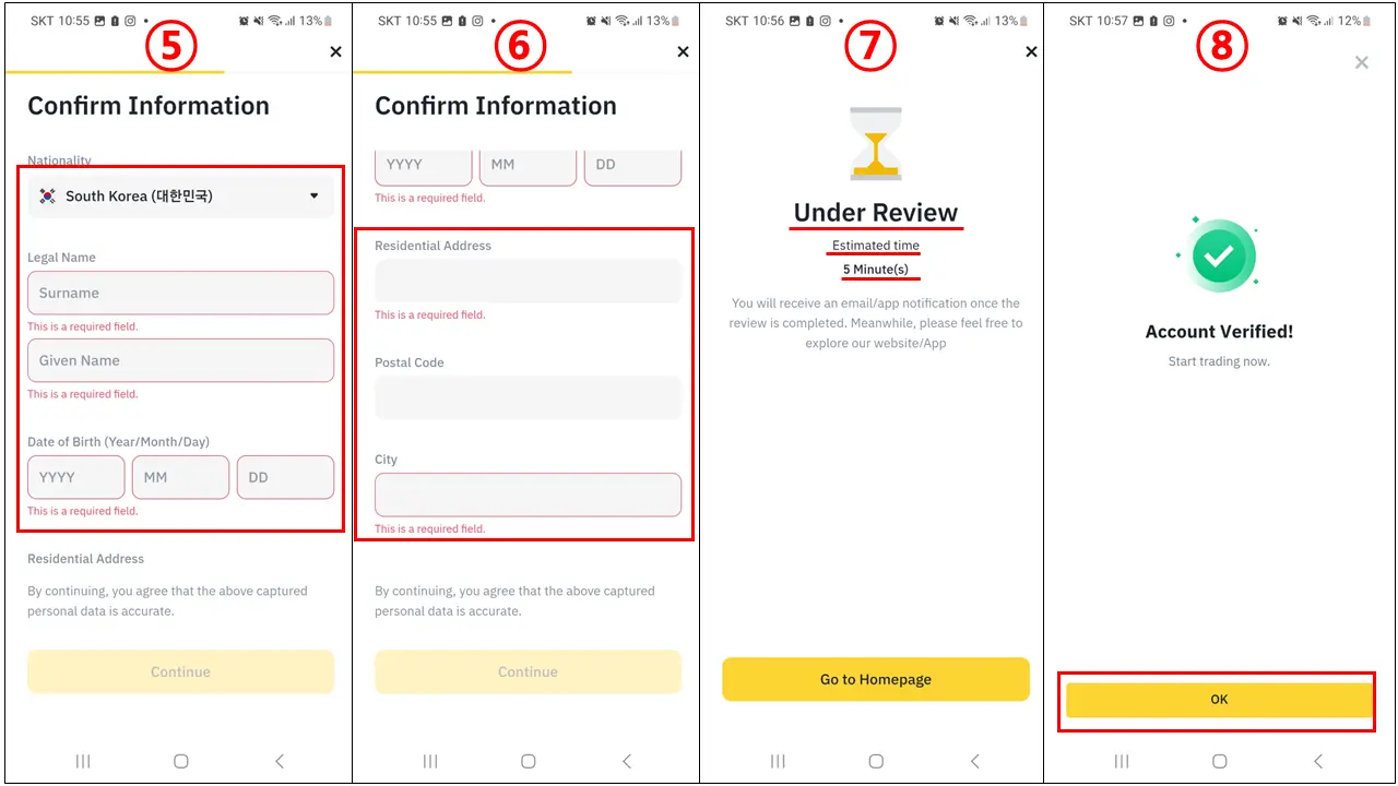 ⑤⑥ 정보 확인 창이 열립니다. 신분증을 촬영했기 때문에 자동 기록됩니다. 별다른 입력을 하지 않으셔도 됩니다. 혹시 자동 기록이 되지 않는다거나 수정할 부분은 직접 입력해 주세요. 한글로 적어도 무관합니다.
