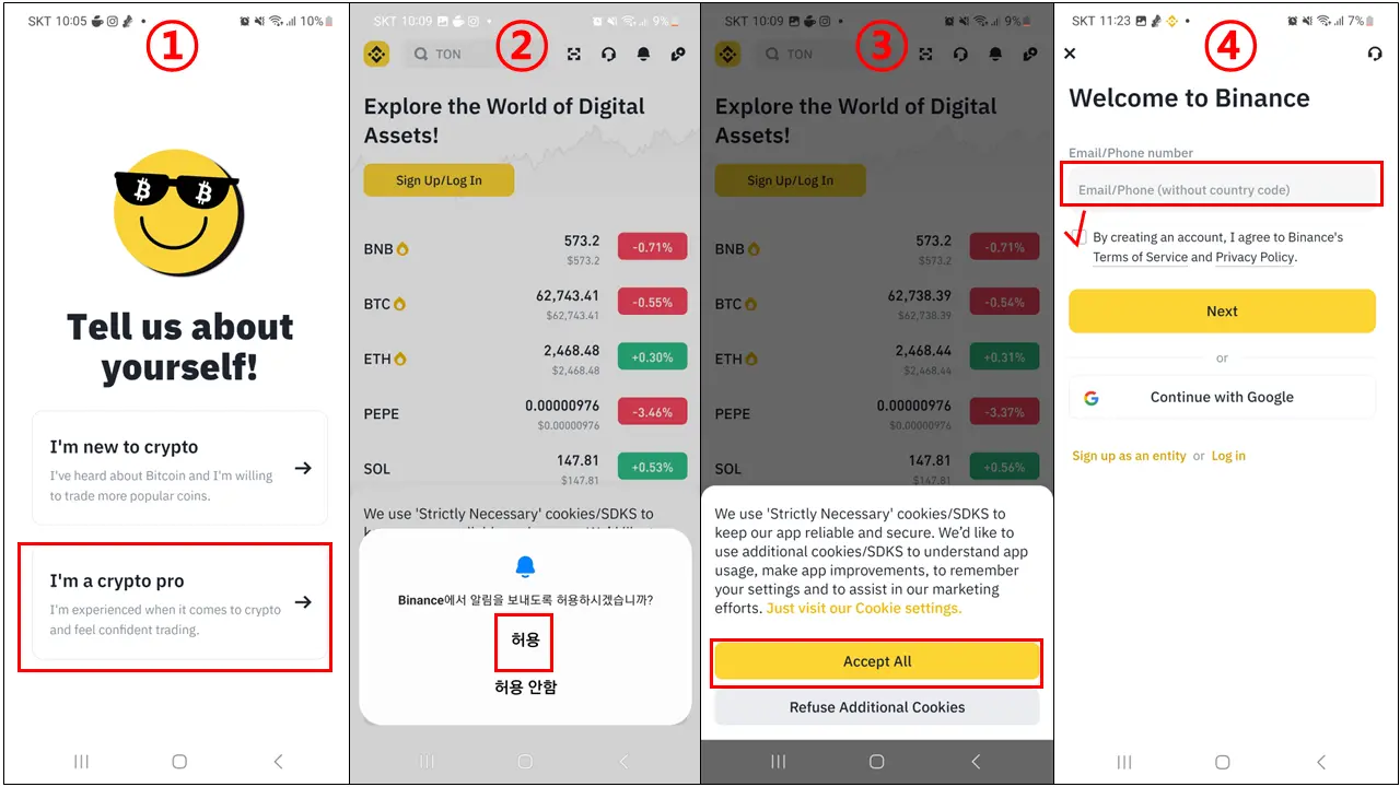바이낸스 어플을 설치후 앱을 실행하셨다면 아래와 같이 천천히 진행하시면 되겠습니다.