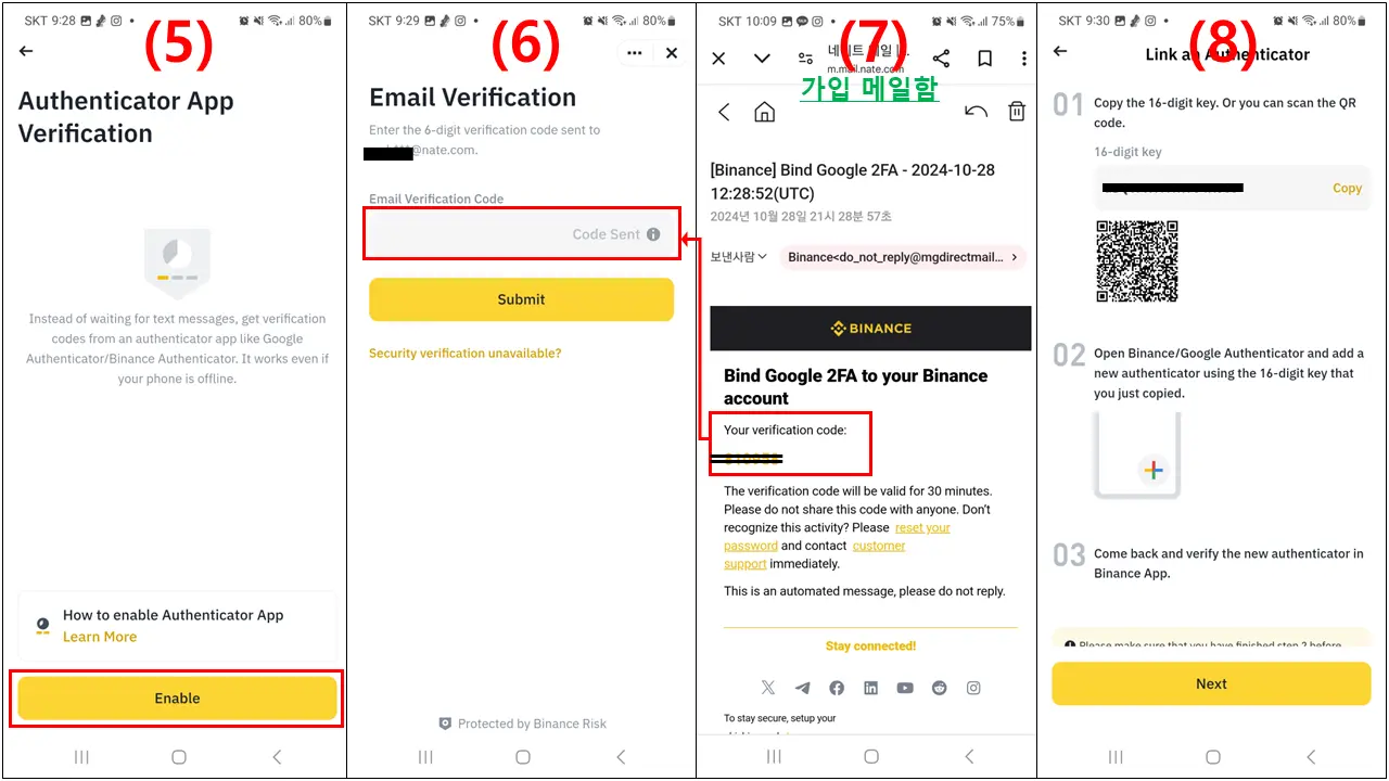 (6)(7) E-mail 인증을 한번더 해줍니다. 가입한 E-mail 로 가서 바이낸스에서 보내준 "코드를 입력"합니다. 그리고 "Submit" 를 클릭해주세요.
