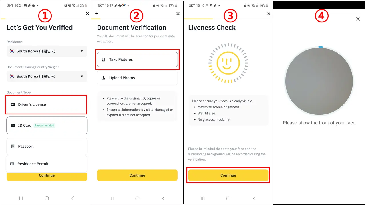 ② "Take Pictures(바로 촬영)" 를 선택하고 "Continue" 를 클릭합니다. 이유는 업로드 된 사진을 올리면 인식이 잘못되면 24시간 이상 검토 시간이 걸릴수도 있습니다. 신분증 사진 촬용중 Flip the document 란 말이 나오면 신분증을 뒤집어 달라는 말입니다.