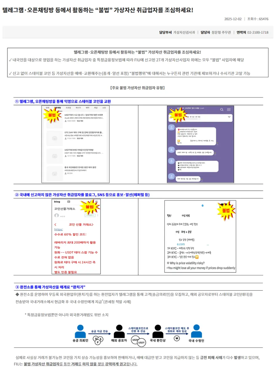 2025년 12월 2일 금융위원회에서 불법 가상자산 취급에 대한 불법행위 및 자금세탁 단속에 대한 보도자료를 발표했습니다.